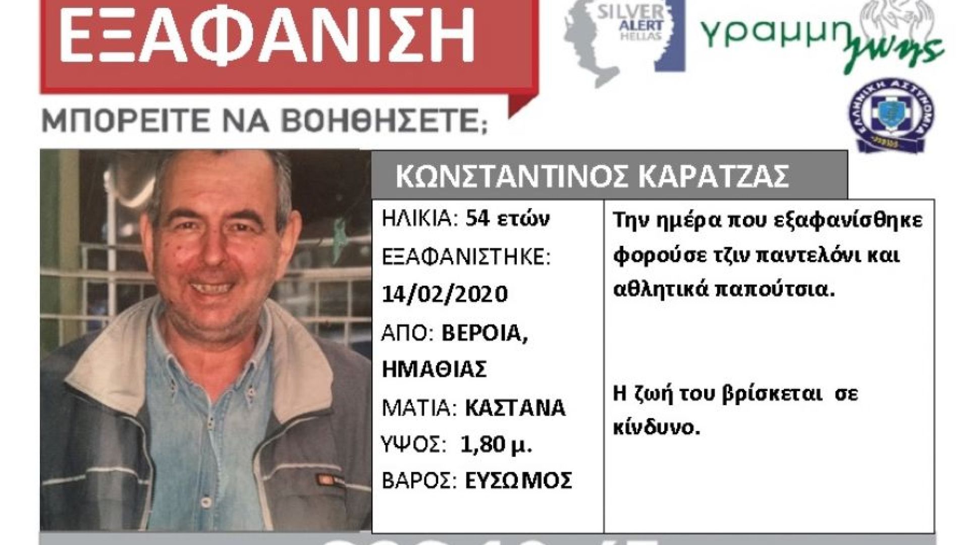 Ένας 54χρονος άνδρας αγνοείται από την Παρασκευή 14 Φεβρουαρίου του 2020 από την πόλη της Βέροιας.