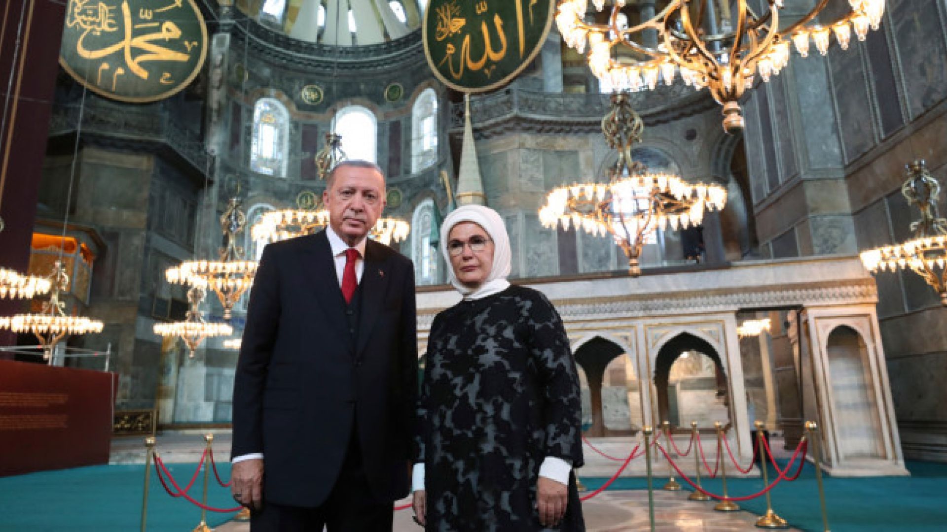 Οι εργασίες και οι πρόβες έγιναν χθες υπό το βλέμμα του Ρετζέπ Ταγίπ Ερντογάν και της συζύγου του, Εμινέ. Ο Ερντογάν, αγνοώντας την διεθνή κατακραυγή για την μετατροπή της Αγίας Σοφίας σε τζαμί, τόσο από ξένες δυνάμεις (μεταξύ των οποίων και ο Τραμπ κατά την συνάντησή του με τον Αρχιεπίσκοπο Ελπιδοφόρο χθες), όσο και από διεθνείς οργανισμούς, παρακολούθησε την πρόοδο των εργασιών και πόζαρε με την σύζυγό του εκτός και εντός του Ναού.