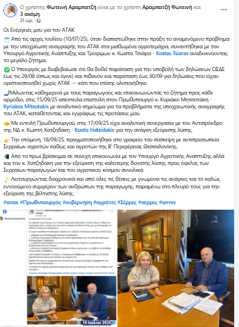 Την επόμενη, 18/09/25, πραγματοποιήθηκε στο γραφείο του σύσκεψη με αντιπροσωπεία Σερραίων αγροτών καθώς και αγροτών της Β’ Περιφέρειας Θεσσαλονίκης.