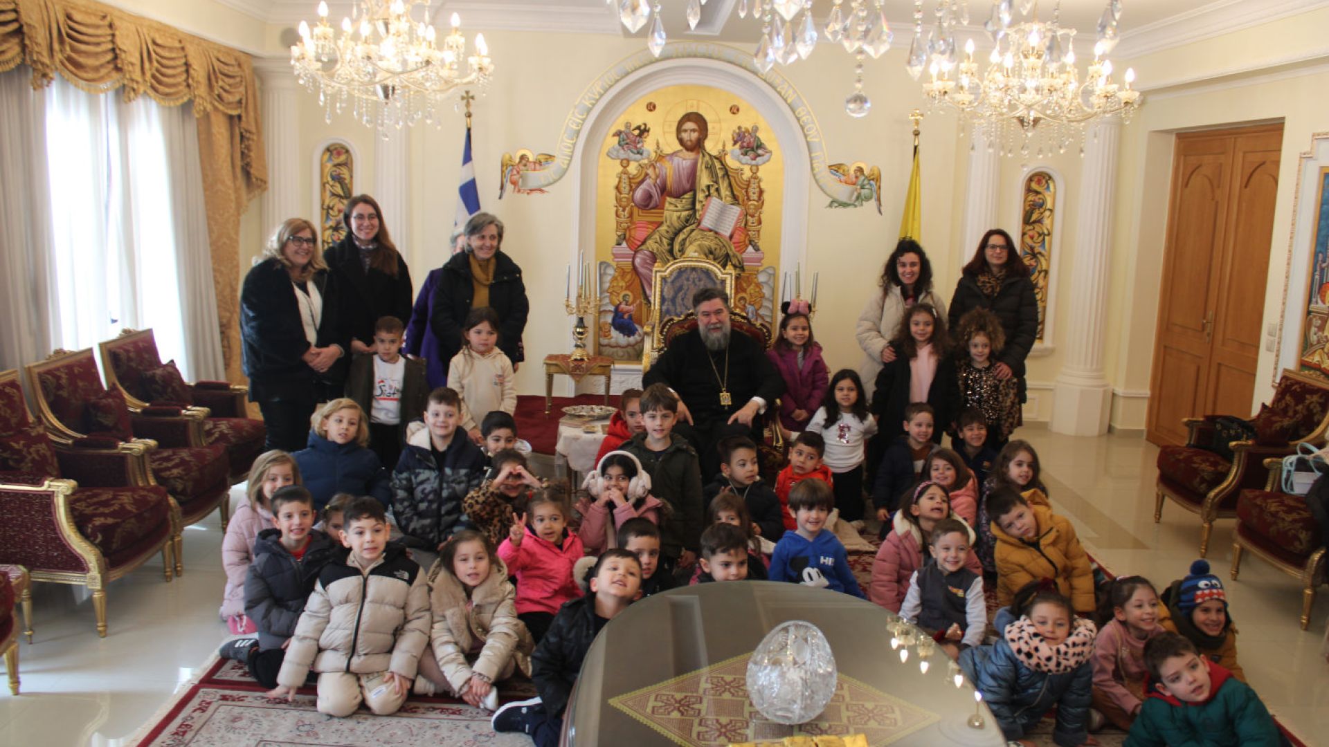 Ο Σεβασμιώτατος υποδέχθηκε τα 130 και πλέον παιδιά, συνοδευόμενα από τους δασκάλους τους και άκουσε, από τους μικρούς αγγελιοφόρους της γεννήσεως του Χριστού τα παραδοσιακά κάλαντα και άλλα χριστουγεννιάτικα τραγούδια. Ακολούθως, τους ομίλησε με απλούς λόγους, για το νόημα της μεγάλης Δεσποτικής εορτής της ενανθρωπήσεως του Κυρίου και την προσφορά του σχολείου στην ζωή του ανθρώπου.