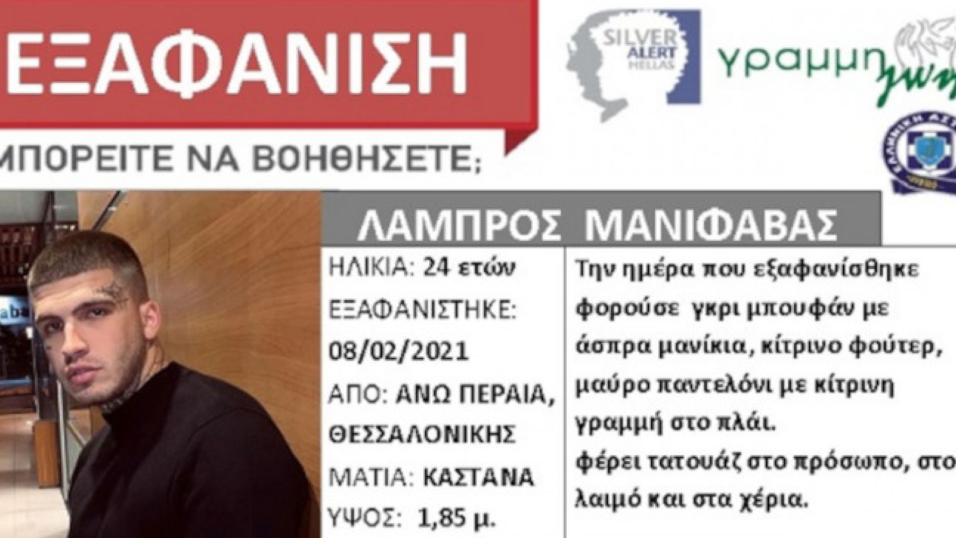 Οι έρευνες της αστυνομίας βρίσκονται σε εξέλιξη παραμένουν, ωστόσο, άκαρπες έως τώρα. Σήμερα, εκδόθηκε ειδοποίηση silver alert, με στοιχεία που μπορεί να βοηθήσουν στον εντοπισμό του. Πρόκειται για τον Λάμπρο Μανιφάβα, 24 ετών, που εξαφανίστηκε από το σπίτι του στην περιοχή Ραντάρ, στην Άνω Περαία Θεσσαλονίκης. Έχει καστανά μάτια, ύψος 1,85μ και είναι κανονικού βάρους. Την ημέρα που εξαφανίστηκε φορούσε γκρι μπουφάν με άσπρα μανίκια, κίτρινο φούτερ και μαύρο παντελόνι με κίτρινη γραμμή στο πλάι.Φέρει τατουάζ στο πρόσωπο, στο λαιμό και στα χέρια.