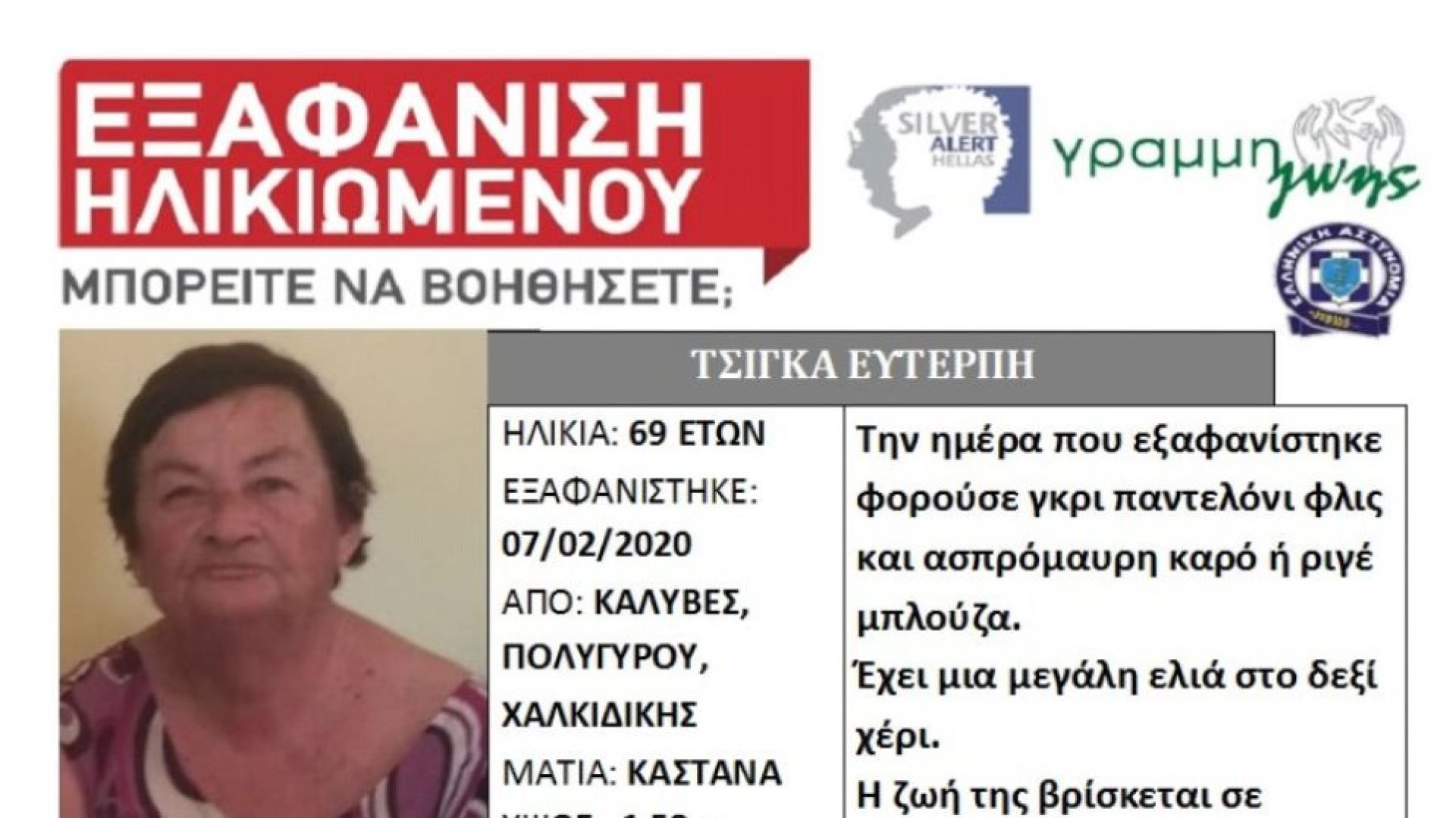Πρόκειται για την Ευτέρπη Τσίγκα, για την εξαφάνιση της οποίας ενεργοποιήθηκε η υπηρεσία Silver Alert.