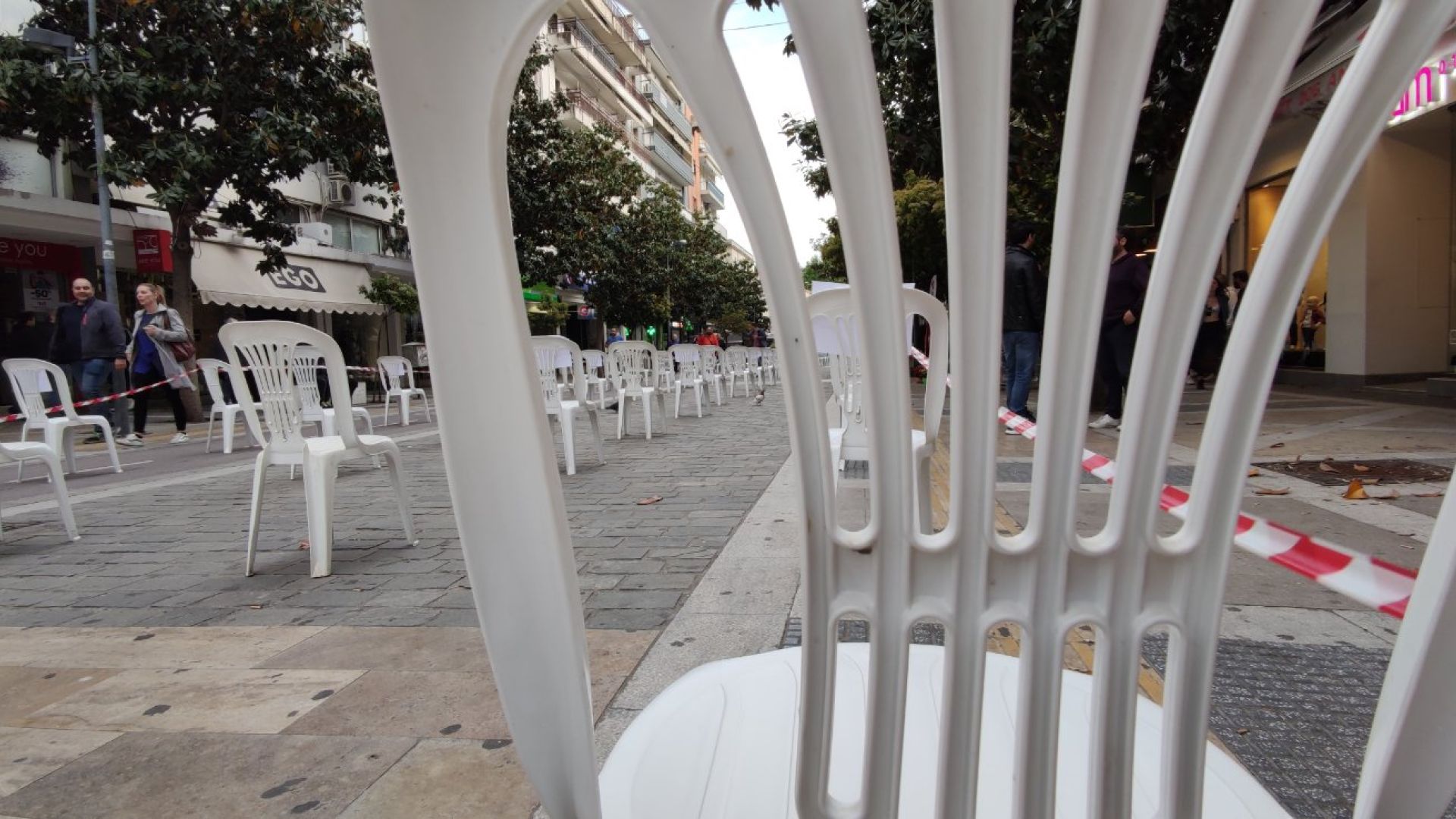 Στήθηκαν τα άδεια καθίσματα στο κέντρο των Σερρών, προκειμένου οι Σερραίοι ιδιοκτήτες καφέ και εστιατορίων να δείξουν την έντονη αντίδραση τους στα νέα μέτρα της Κυβέρνησης.
