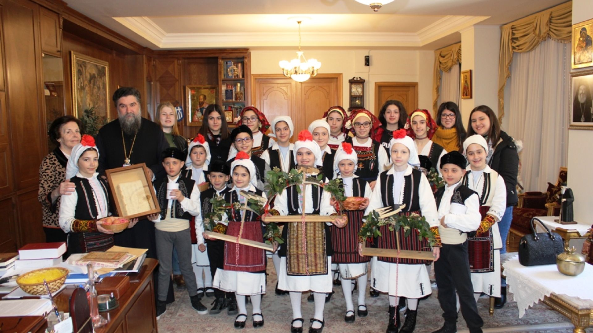 Ο Σεβασμιώτατος υποδέχθηκε τα 30 και πλέον παιδιά, συνοδευόμενα από την Πρόεδρο του Λυκείου Ελληνίδων κ. Στ. Ελευθεριάδου και μέλη του Συλλόγου και άκουσε από τους μικρούς αγγελιοφόρους της Άνοιξης, τα παραδοσιακά κάλαντα της Ανοίξεως, τα «χελιδονίσματα». Τα παιδιά, ενδεδυμένα τις παραδοσιακές τους στολές και με ξύλινα ομοιώματα χελιδονιών στα χέρια, ευχαρίστησαν τον πνευματικό τους πατέρα για την φιλοξενία και του προσέφεραν τον παραδοσιακό «μάρτη».