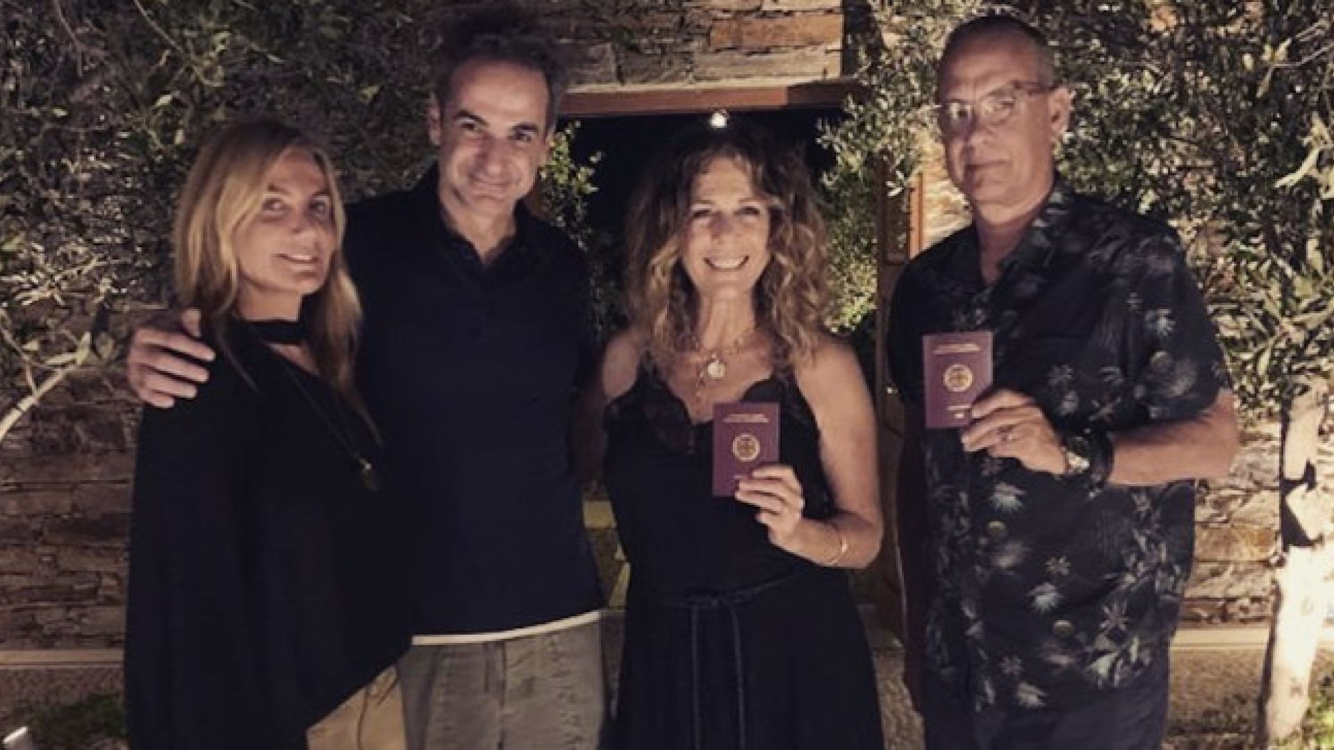 Ο Τομ Χανκς και η Ρίτα Γουίλσον βγήκαν χθες αναμνηστική φωτογραφία κρατώντας τα ελληνικά τους διαβατήρια, τα οποία μόλις παρέλαβαν, αφού ύστερα από πρωτοβουλία του Κυριάκου Μητσοτάκη έχουν πολιτογραφηθεί Έλληνες.