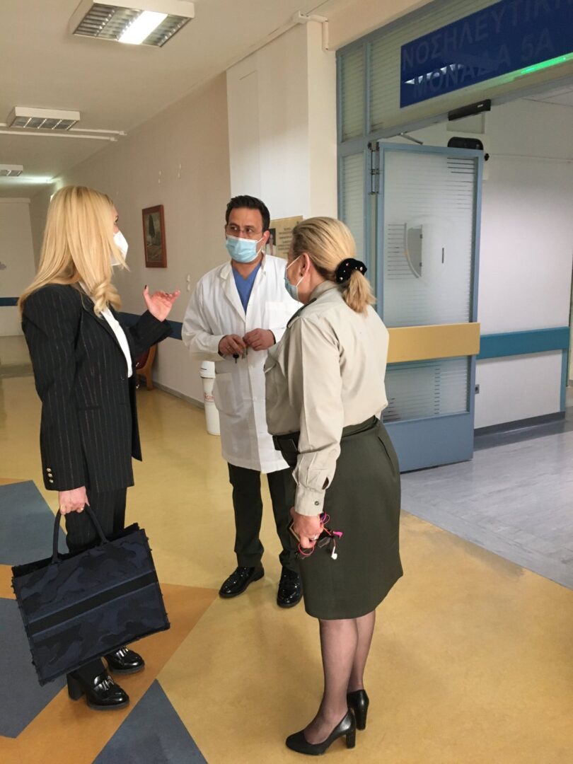 Η Σερραία Υφυπουργός βρέθηκε στο 401 Γενικό Στρατιωτικό Νοσοκομείο Αθηνών νωρίς το μεσημέρι της Τετάρτης (10/03/2021), όπου και τηρώντας όλα τα απαραίτητα μέτρα επισκέφθηκε στον θάλαμο νοσηλείας τον τραυματία αστυνομικό, συνομίλησε μαζί του και τον ευχαρίστησε –και στο πρόσωπό του όλη την ΕΛ.ΑΣ.- για την προσφορά του στη θωράκιση του αισθήματος της ασφάλειας του πολίτη, εκτελώντας το χρέος του απέναντι στην Πολιτεία και στην Κοινωνία.