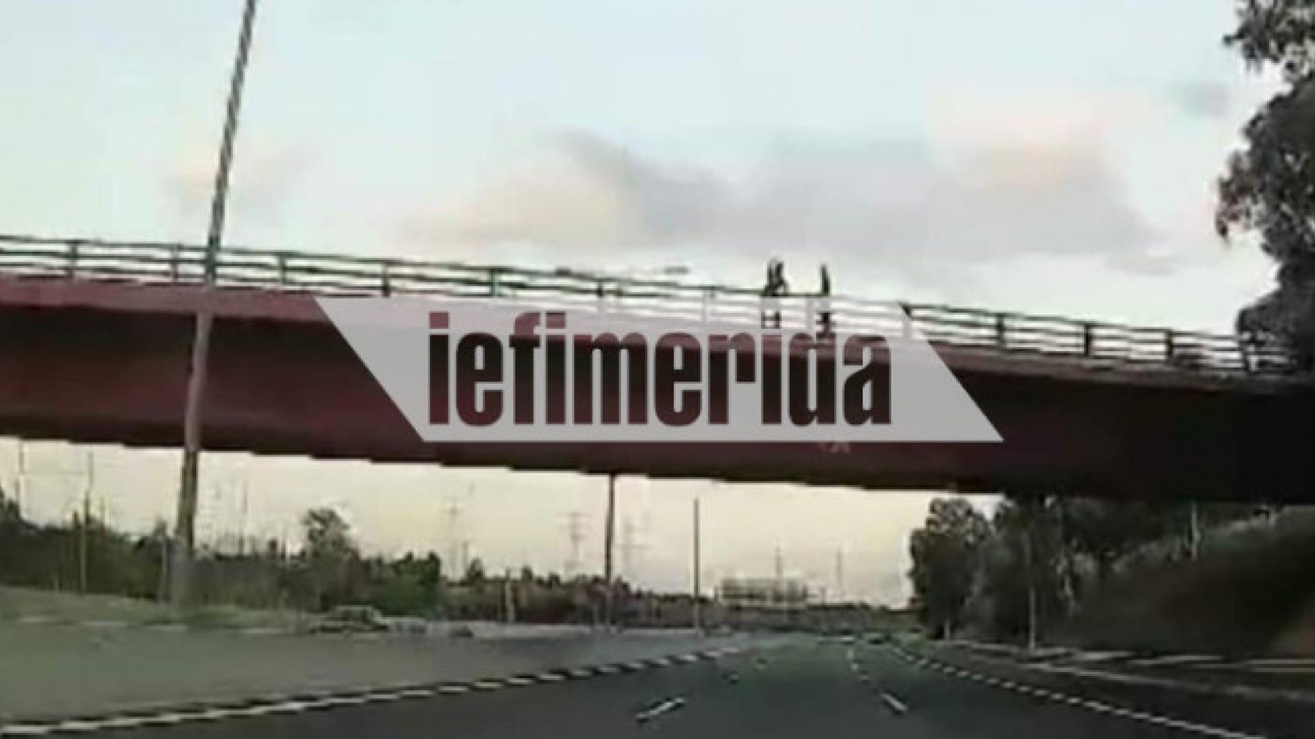 Οι επιβάτες αυτοκινήτου κατέγραψαν δύο άτομα πάνω σε γέφυρα στην εθνική οδό Αθηνών – Κορίνθου ένα χιλιόμετρο περίπου πριν τον Ισθμό να πετούν πέτρες στα διερχόμενα ΙΧ.