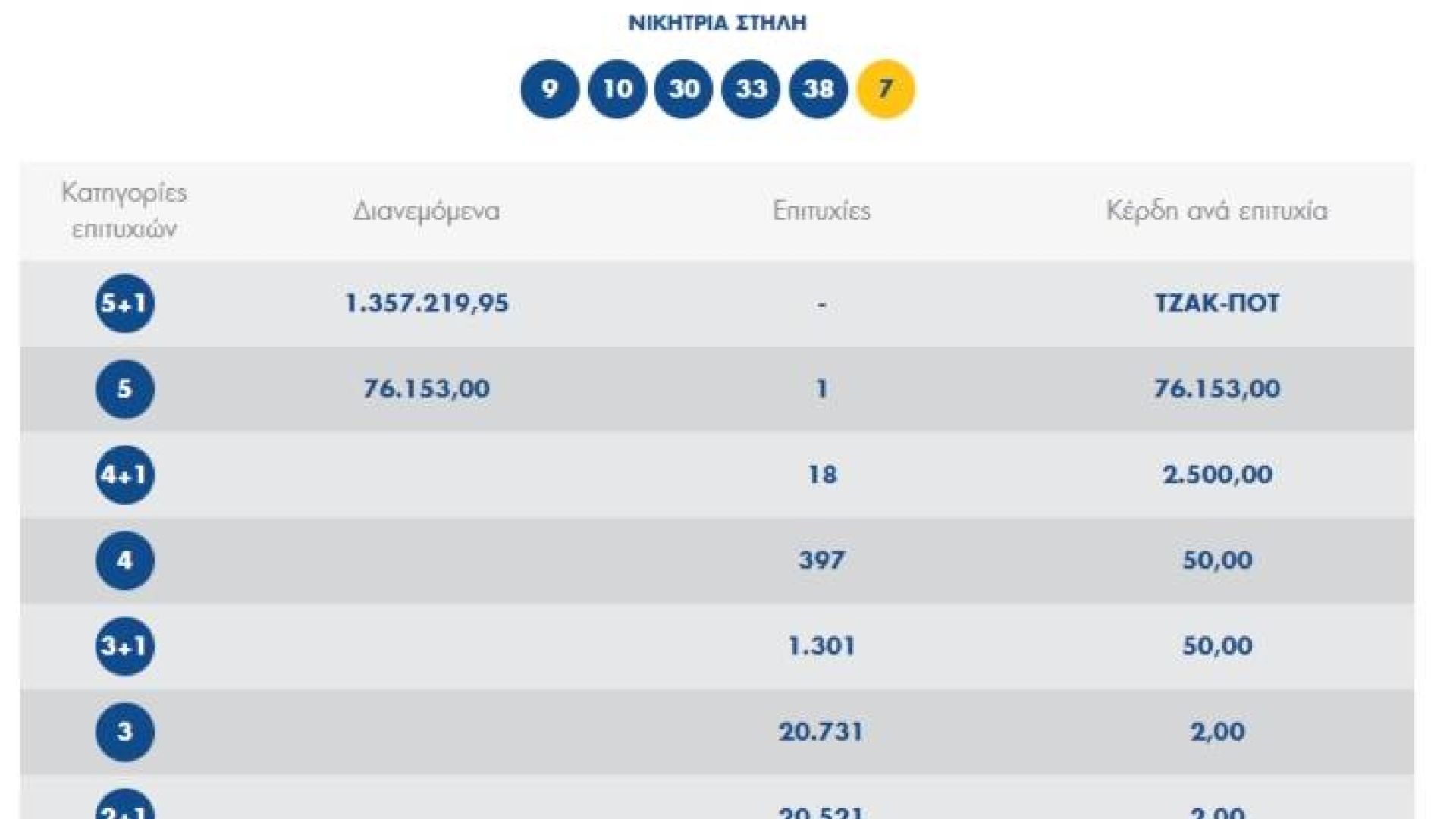 Οι τυχεροί αριθμοί στην σημερινή κλήρωση Τζόκερ είναι οι εξής: 10, 38, 30, 9, 33 και Τζόκερ ο αριθμός 7.