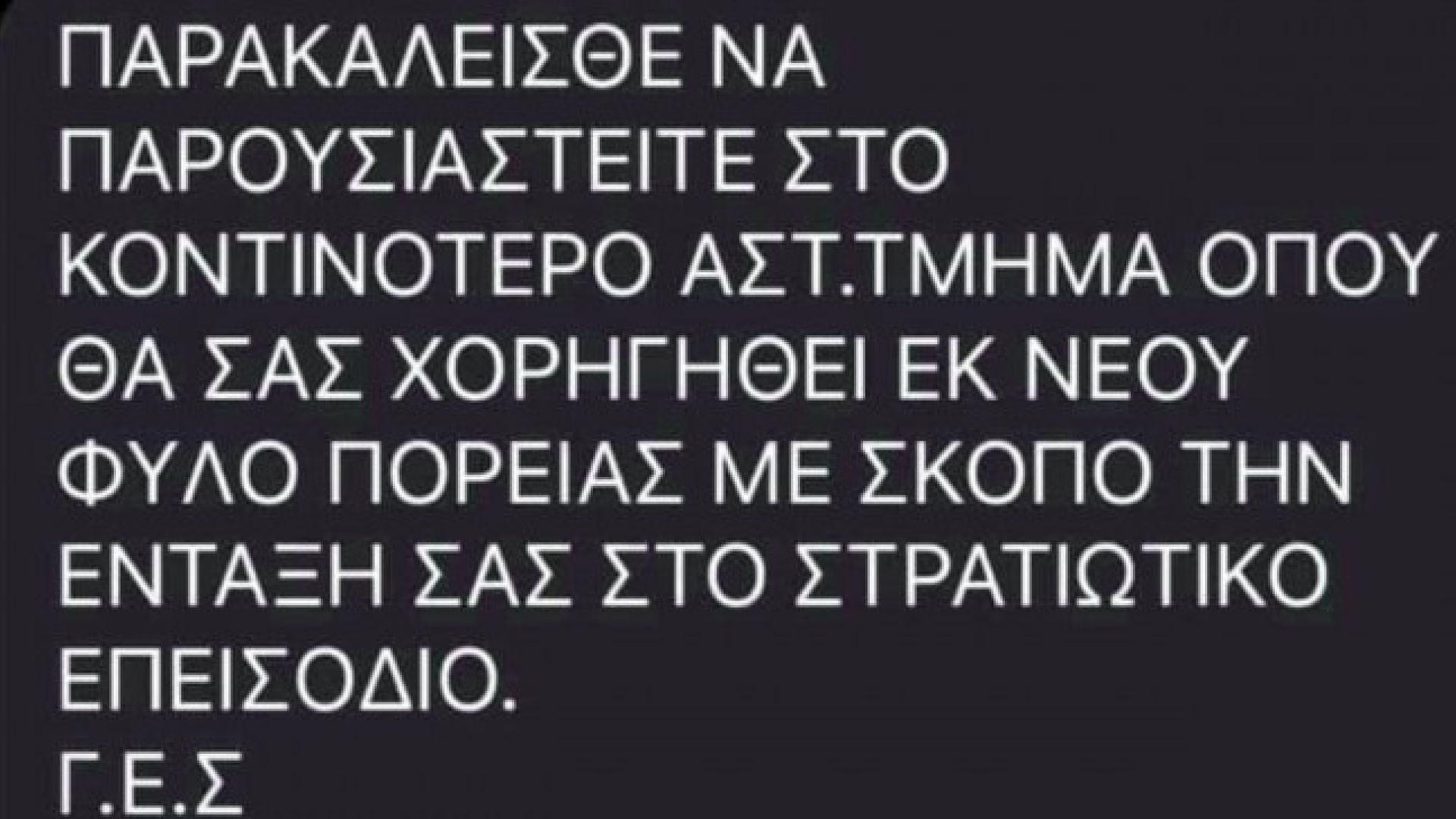Συγκεκριμένα, το μήνυμα με αποστολέα το υπουργείο Άμυνας καλεί τους παραλήπτες να παρουσιαστούν στο κοντινότερο αστυνομικό τμήμα προκειμένου να τους χορηγηθεί φύλλο πορείας «με σκοπό την ένταξή σας στο στρατιωτικό επεισόδιο».
